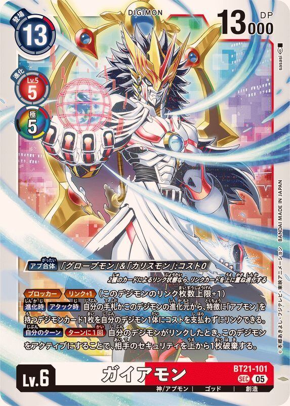 〔アプ合体〕「グローブモン」&「カリスモン」:コスト02種のカードによるリンク状態なら、リンクカードを上に重ね進化する≪ブロッカー≫≪リンク+1≫(このデジモンのリンク枚数上限+1)【進化時】【アタック時】自分の手札かこのデジモンの進化元から、特徴に「アプモン」を持つデジモンカード1枚を自分のデジモン1体にコストを支払わずにリンクできる。【自分のターン】[ターンに1回]自分のデジモンがリンクしたとき、このデジモンをアクティブにすることで、相手のセキュリティを上から1枚破棄する。