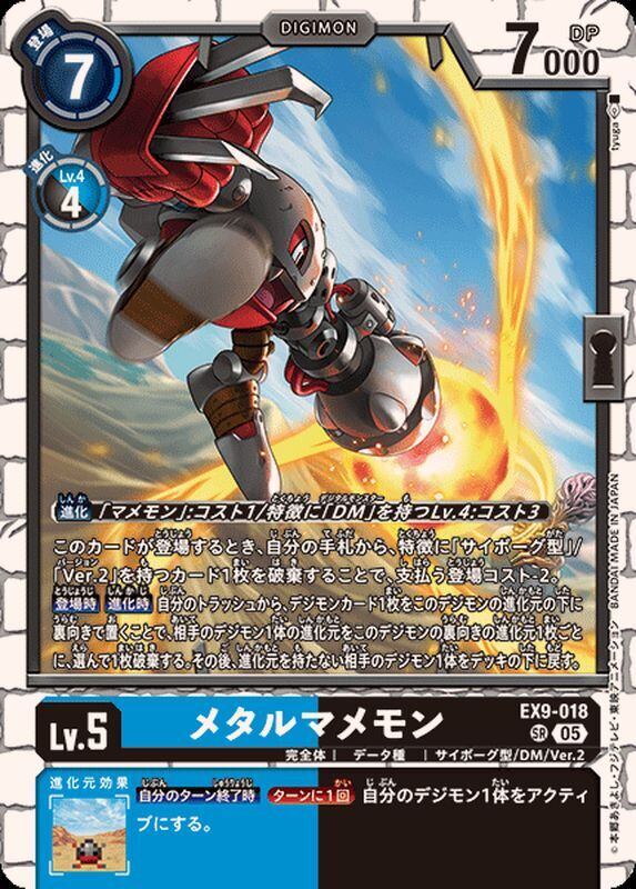 〔進化〕「マメモン」:コスト1/特徴に「DM」を持つLv.4:コスト3このカードが登場するとき、自分の手札から、特徴に「サイボーグ型」/「Ver.2」を持つカード1枚を破棄することで、支払う登場コスト-2。【登場時】【進化時】自分のトラッシュから、デジモンカード1枚をこのデジモンの進化元の下に裏向きで置くことで、相手のデジモン1体の進化元をこのデジモンの裏向きの進化元1枚ごとに、選んで1枚破棄する。その後、進化元を持たない相手のデジモン1体をデッキの下に戻す。【自分のターン終了時】[ターンに1回]自分のデジモン1体をアクティブにする。